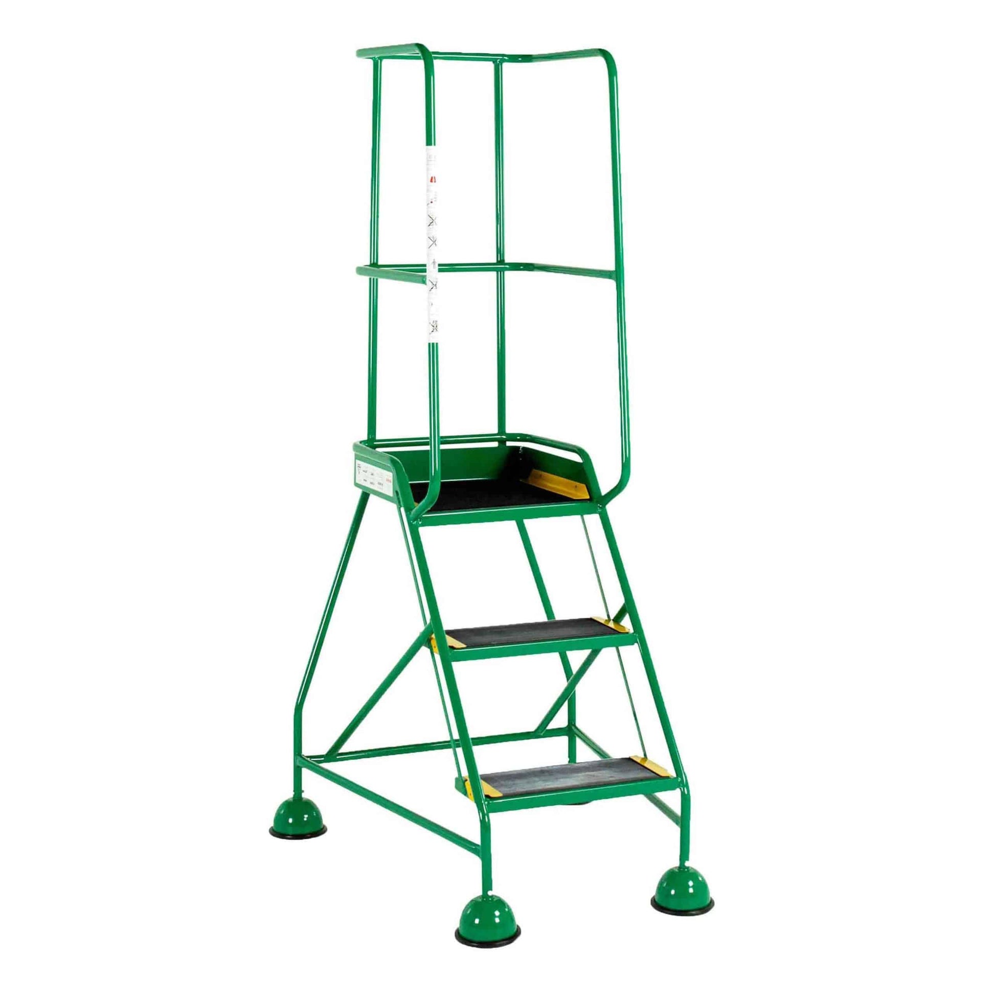 The steps have a handrail around three sides of the platform, which is also the second step. The three steps come with either ribbed rubber or anti-slip treads for added safely. Ribbed rubber treads are supplied with tread clamps to prevent edges peeling.