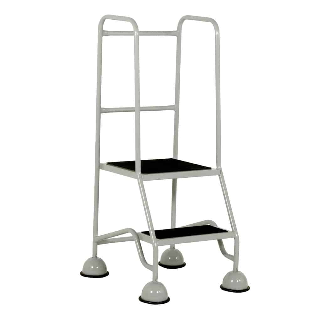 These steps are fitted with dome covered spring loaded swivel castors which retract when weight is applied to the steps. giving them firm contact with the floor. Dome covers have a double rolled bottom edge together with a protective cover strip and grey non-marking tyres.