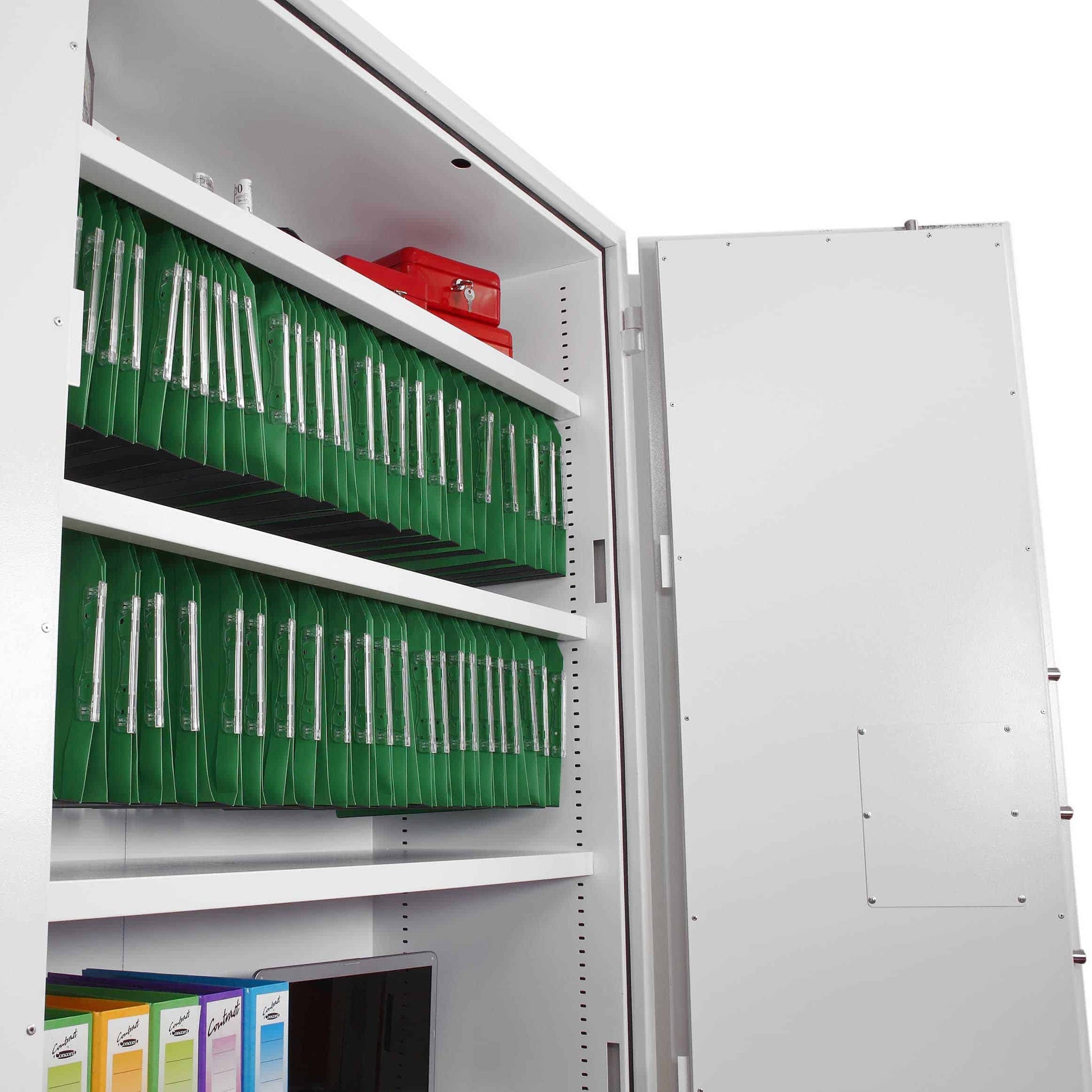 The safe comes high quality lock with two keys and height adjustable shelves with hanging rails for lateral files and provides 30 minutes fire protection for paper records at 500°C.