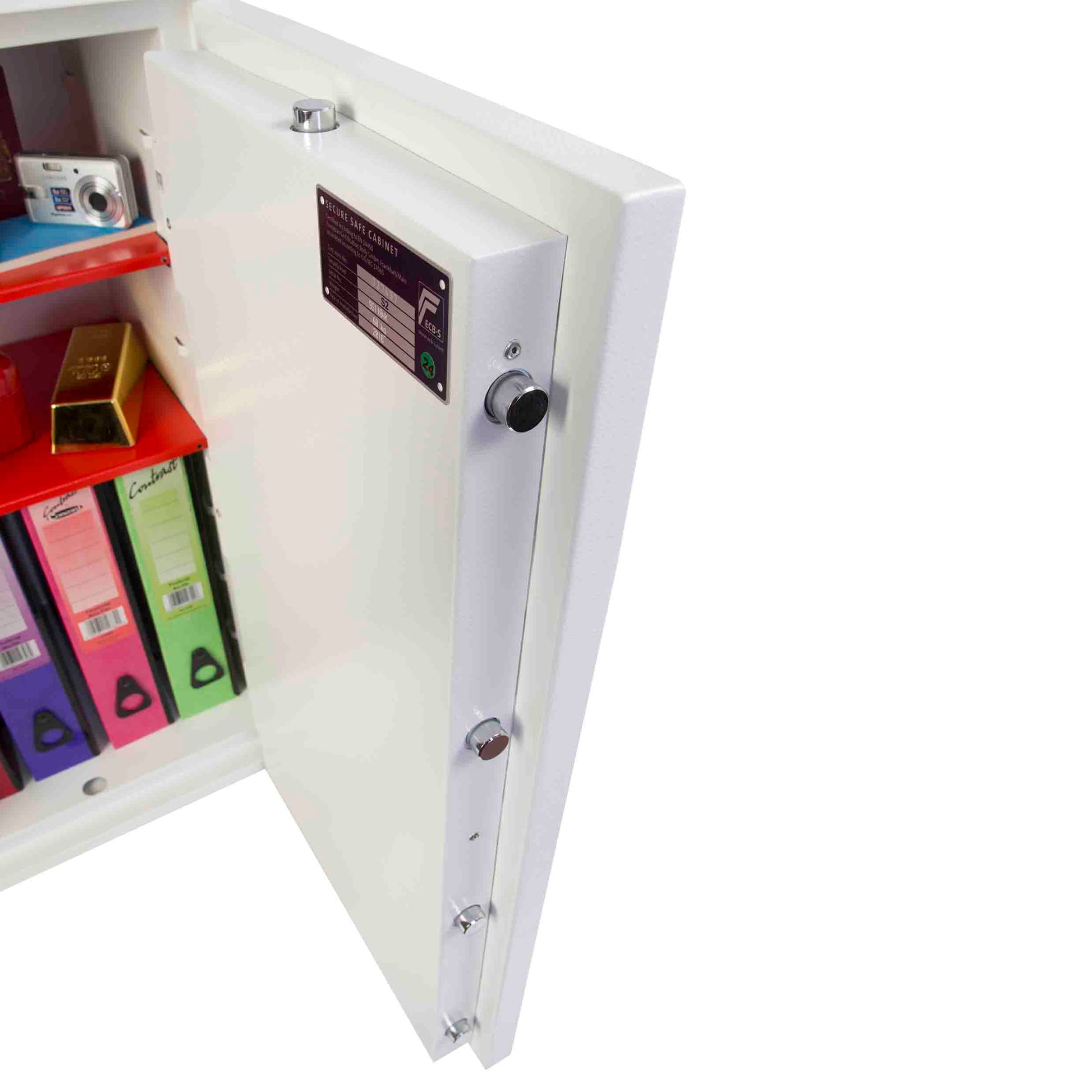 The safe comes with a high security electronic lock with dual control, master code and time delay, as well as fixing bolts for floors and walls.