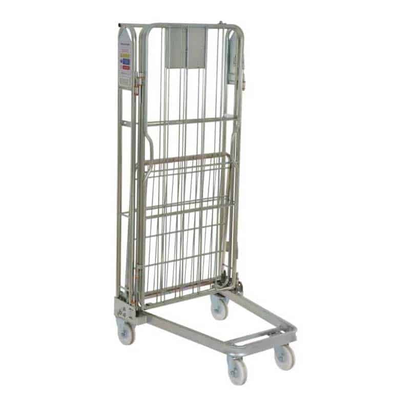 This four-sided nestable A-frame roll pallet has a reinforced design with a rod infill structure. The full height gate, three sides and base have a rod infill structure. The gate is designed with hand grips for easier access to stowed products. The sides, gate and base all fold so they are flush with the back panel.