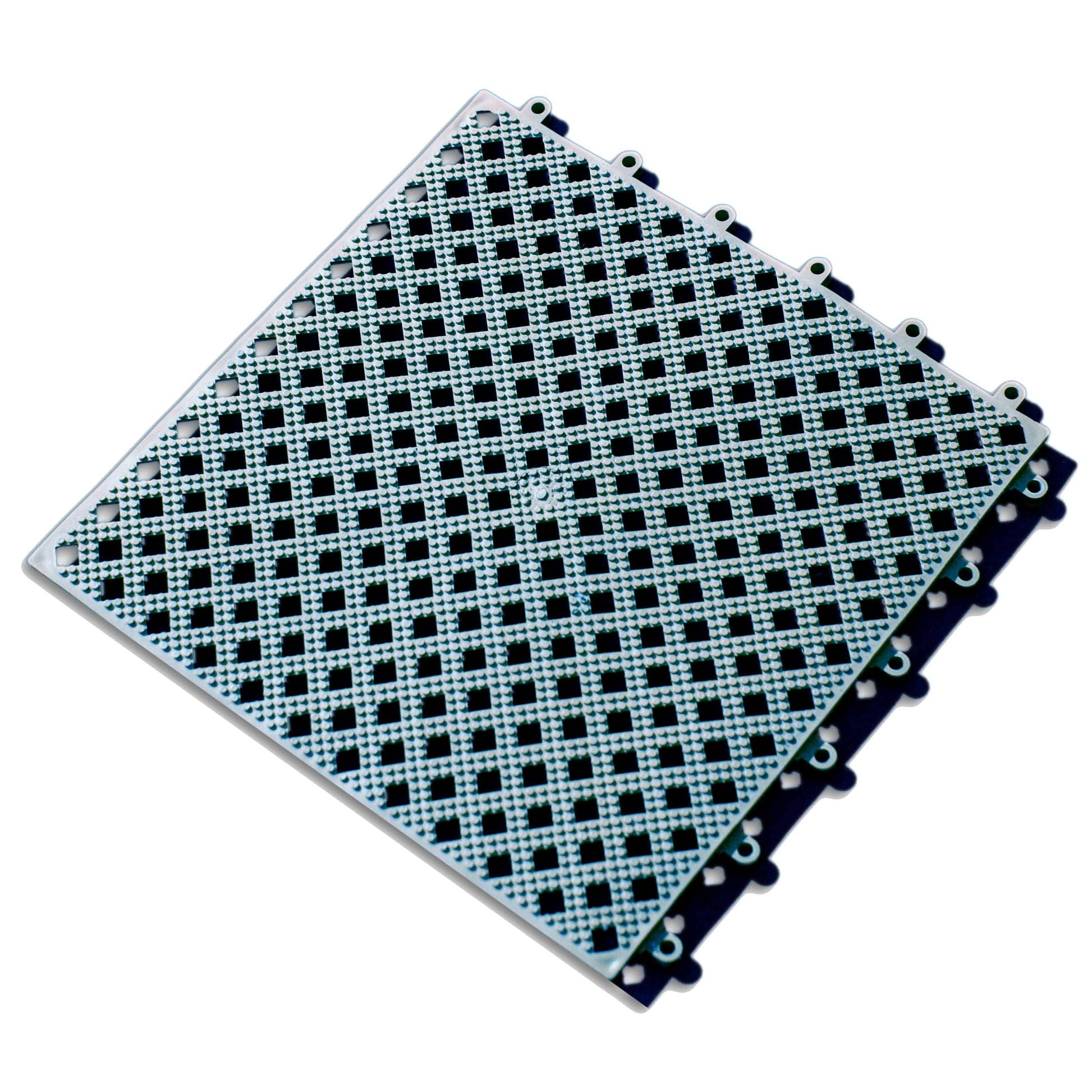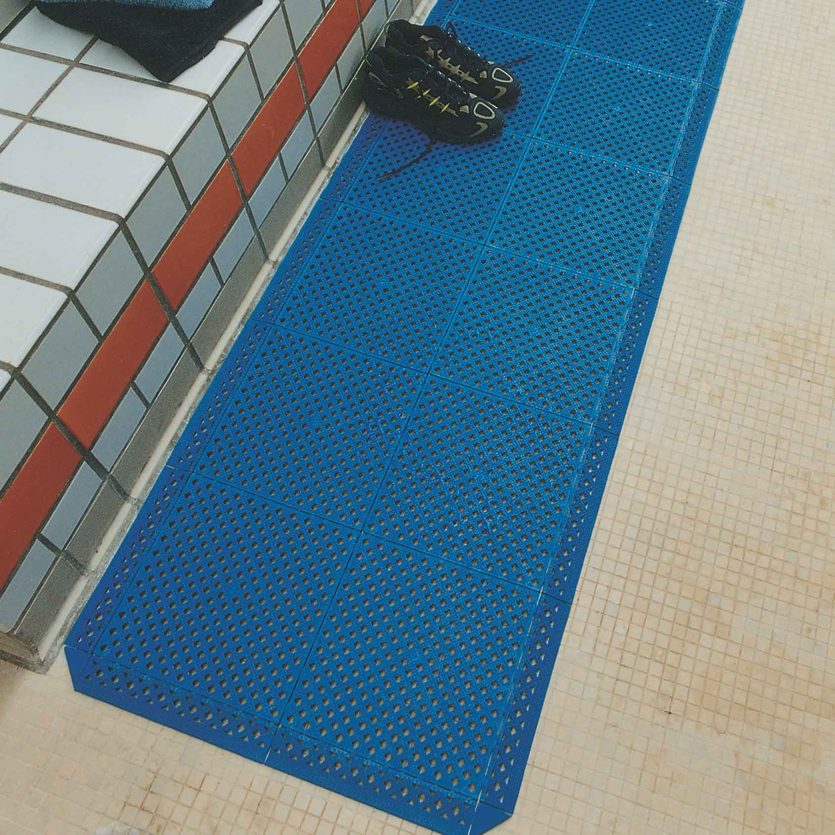 The soft PVC construction provides barefoot comfort when used in a leisure environment, at the same time providing effective anti-fatigue properties for industrial use. The simple and effective interlocking system ensures a firm, quick joint which can be easily, but not accidentally released.