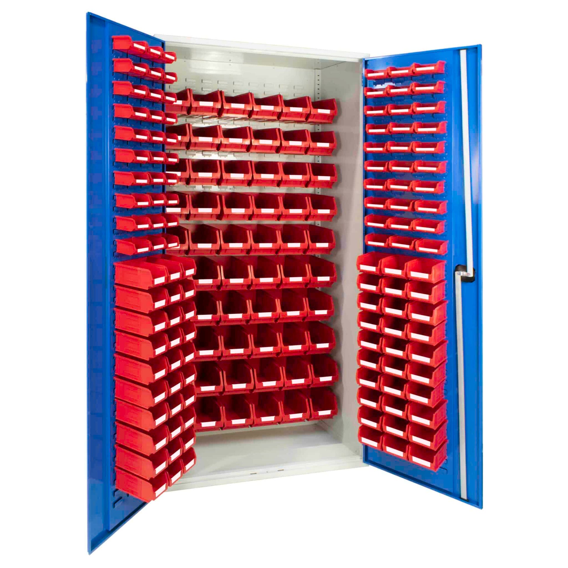 The cabinet comes with 60 x TC1 red bins, 60 x TC2 red bins and 60 x TC3 red bins, as well as a full length louvre back panel and full length louvre panels on each door. A fully recessed handle with 3 point locking and two keys is supplied with each cupboard, helping to keep your items safe and secure.