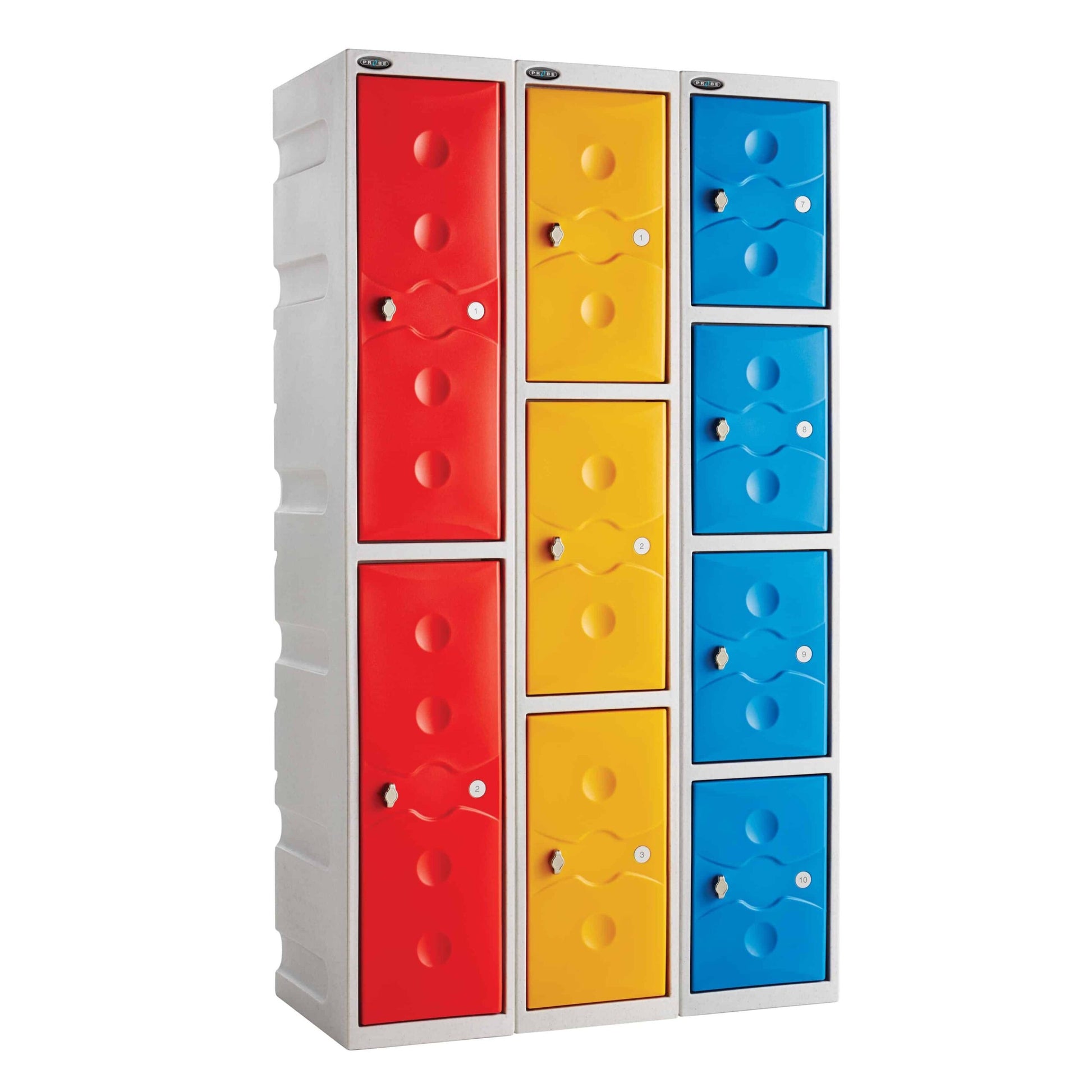 Probe Ultrabox Plus plastic lockers come in a range of door colours with a speckled grey carcass, there are also a range of waterproof lock options to choose from.