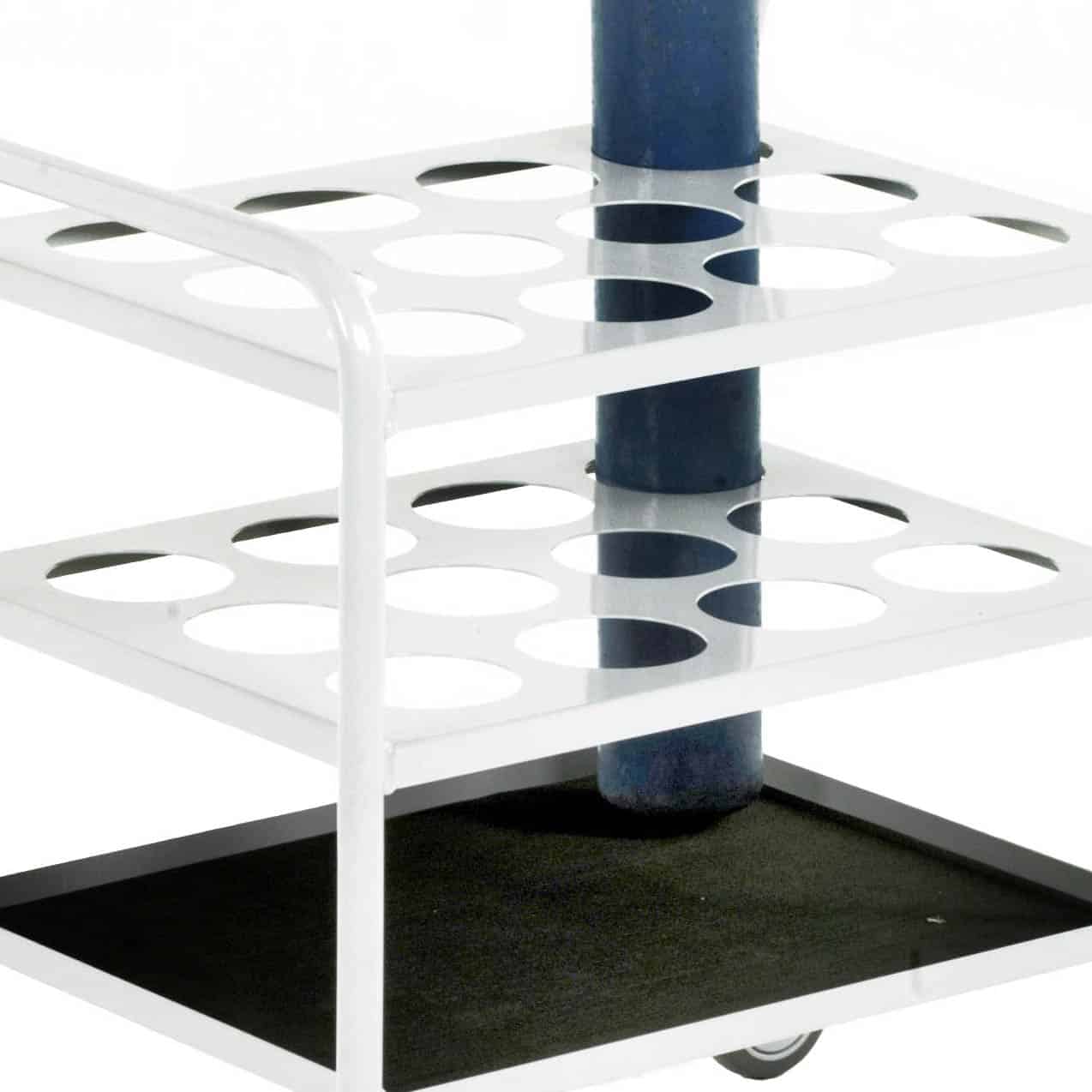 The cylinder trolleys are designed to carry twelve size D or E oxygen cylinders. The trolleys come with twelve 108mm diameter hole supports complete with a rubber cushioning to the bottom deck.